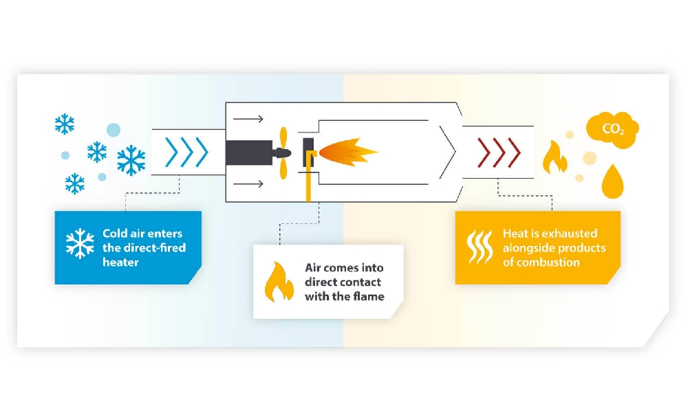A direct-fired heater burns diesel fuel to generate a flame inside an open combustion chamber. A fan blows air directly across this flame, warming it before distributing it into the space. The air that passes through the combustion area carries some by-products, such as water vapour and carbon dioxide, into the environment.