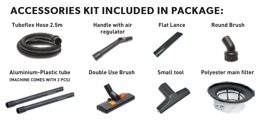 • Supplied with Tuboflex Hose 2.5m, Handle with air regulator, Flat lance, Round brush, Aluminium-Plastic tube 2pc, Double use brush, Small tool and Polyester main filter