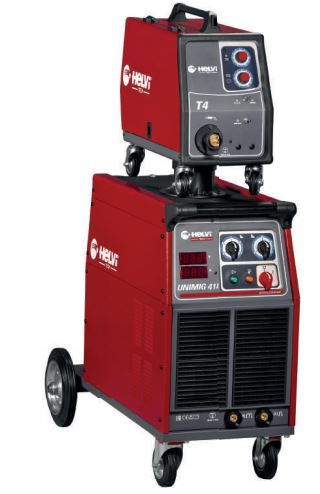 The Helvi UniMig 418SWF Mig Welder is a three-phase industrial unit on wheels, equipped with a 4 roll seperate wire feeder. This welder features a timer for spot welding and also welding current and arc voltage displays. It is well suited for the medium-sized industrial welding workshop.