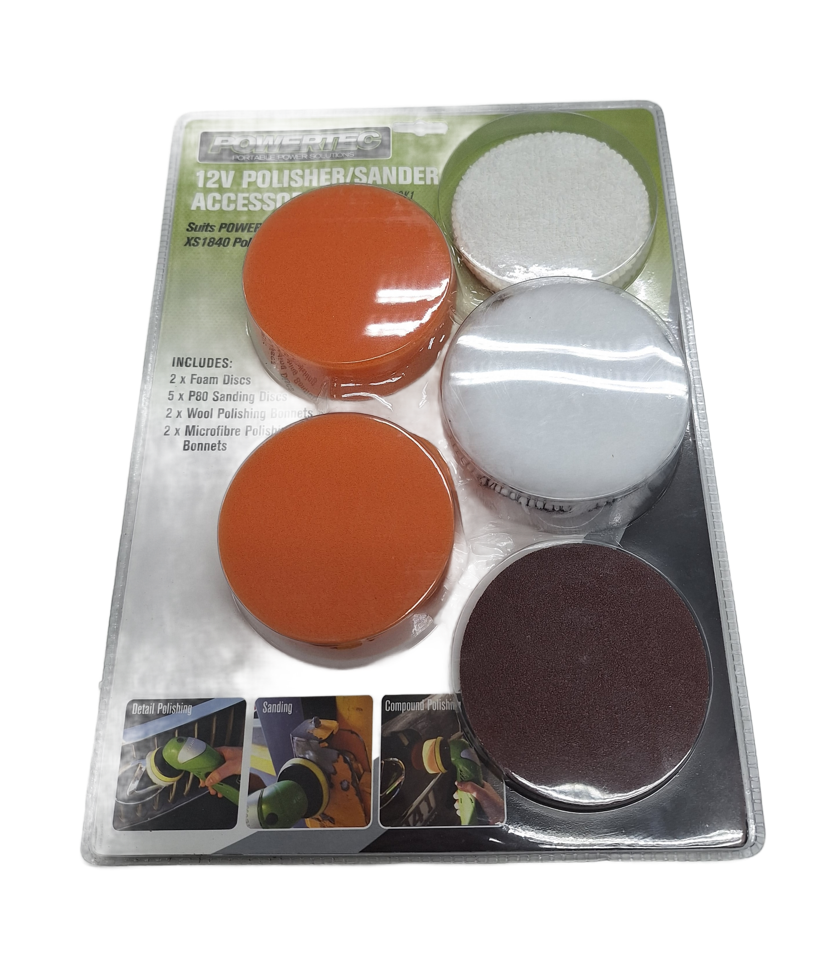 2x Foam Discs, 5x P80 Sanding Discs, 2x Wool Polishing Bonnets, & 2x Microfibre polishing Bonnets