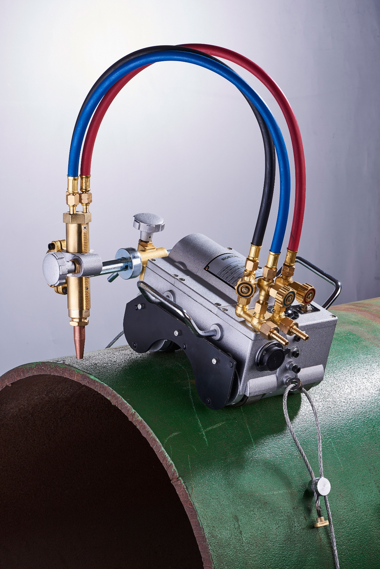 A magnetic pipe-cutting machine which uses magnetic rollers to stay attached to the pipe.  Making setup fast & easy.
