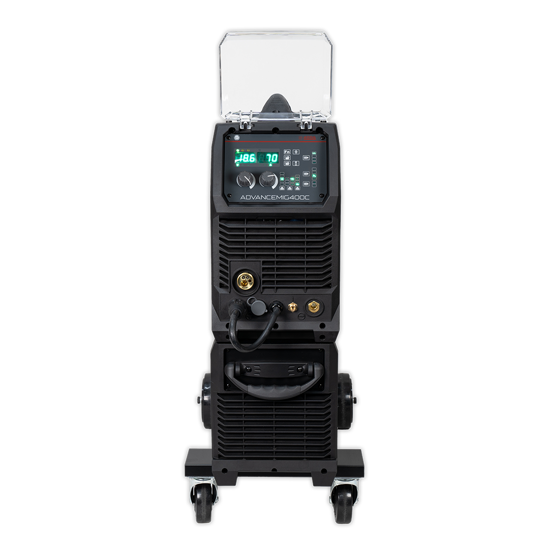 The AdvanceMig400C delivers 400A of power with intelligent synergic controls, a 4-roll geared wire feed unit, and optional heavy-duty trolley—perfect for peak performance and durability in demanding environments.